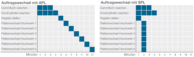 Eine der neuen Schlüsseloptionen ist der neue simultane Plattenwechsel (SPL). Jetzt können Drucker auf Knopfdruck Plattenwechsel und Waschvorgänge zur gleichen Zeit durchführen – das spart je nach Länge bis zu 7,5 Minuten pro Auftrag. Das bedeutet gleichzeitig, dass über die Schichten bis zu 2,7 Millionen Druck freie Kapazität geschaffen wird. Im Ergebnis sinken die Produktionskosten beträchtlich, einhergehend mit höheren Margen und höherer Wettbewerbsfähigkeit.