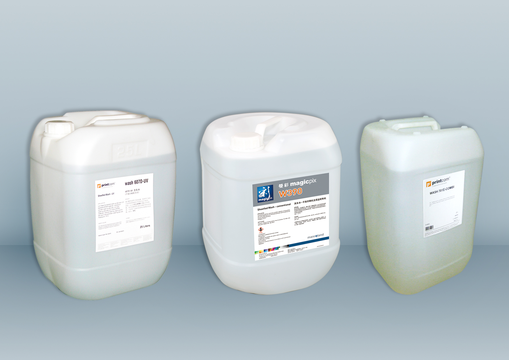在各种与工艺过程兼容的系统组件中,清洗剂起到很重要的作用。选择合适的清洗剂,对印刷质量和整个印刷过程的经济性具有重大的影响。printcom®普德康及magicpix® 曼彩品牌的各款清洗液已通过严格的技术测试, 在各方面都有出色的表现。