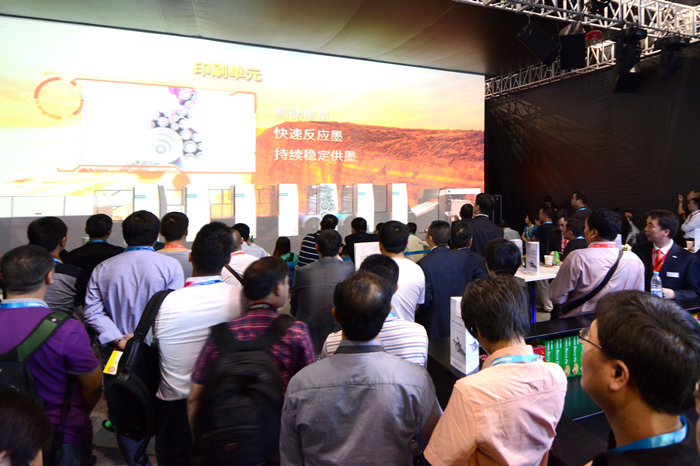 曼罗兰大中华区董事长贺文先生表示:“为了配合本届炫酷的参展口号‘一触未来’,我们打破传统惯例,以极富有未来动感的3D视觉幻彩秀向观众演绎新一代ROLAND 700 HiPrint的各项全新功能,其中包括SPL同步换版技术、InlineFoiler联线冷烫装置、QuickChange快速转换系统等。这样,我们就可以在视觉、听觉上和观众一起体验One Touch一键印刷的未来。”